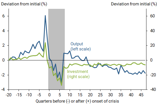 Figure 3 shows the paths for output and investment in a typical simulated crisis from our model. Because crises tend to last a year or two, in this experiment we focus on crises lasting at least eight quarters. We consider a window starting 20 quarters before the onset of the crisis, followed by the eight quarters of the crisis (gray bar) and then the post-crisis recovery.