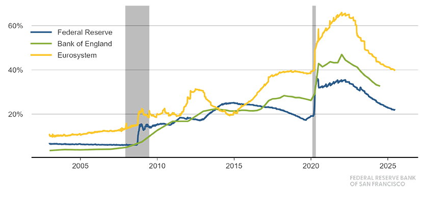 It is true that balance sheets have grown. Indeed, they increased substantially during the GFC and the pandemic as central banks supported financial markets and their economies (see Figure 1). Balance sheets reached roughly 45, 65, and 35 percent of GDP in the United Kingdom, Eurosystem, and United States, respectively. They have come down from their peak but remain larger than before the financial crisis.