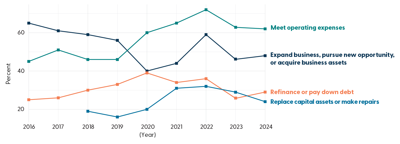 A collaboration of the 12 Federal Reserve Banks, the annual SBCS collects data on small businesses’ financial needs, business performance, and emerging issues. The 2024 survey was fielded from September to November 2024 and reached more than 7,600 small employer firms nationally.