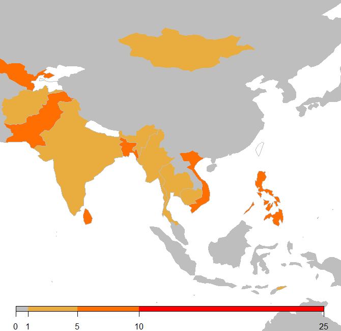 Remittance inflows represent a substantial source of income for emerging Asian economies (see Figure 1 and Table 1). Countries like India and the Philippines receive larger flows from remittances than foreign direct investment, bringing in foreign currency to improve the balance of payments. The Philippines is perhaps the country most famous for its emigrant workers and nearly 10% of its GDP is composed of remittances. Nepal, a low income country with a large proportion of overseas workers, gets nearly 30% of GDP from remittances, the largest share in Asia. In 2014, India had the highest gross level of remittance flows in the world at over $70 billion, and China was not far behind at over $62 billion, although remittances play a smaller role in its larger economy.