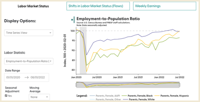 The SF Fed Data Explorer grew out of this need to track the evidence on labor market experiences for broad and diverse groups in the U.S. population. For example, a regular look at the data below has shown how the strong economy over the past year has helped bring mothers back into the workforce. The data on mothers is divided into different demographic groups. The yellow line shows that employment gains for Hispanic women have been strong, closing the gap caused by the pandemic. The green line shows us that Black mothers have still not closed the remaining gap caused by the COVID-19 disruptions.