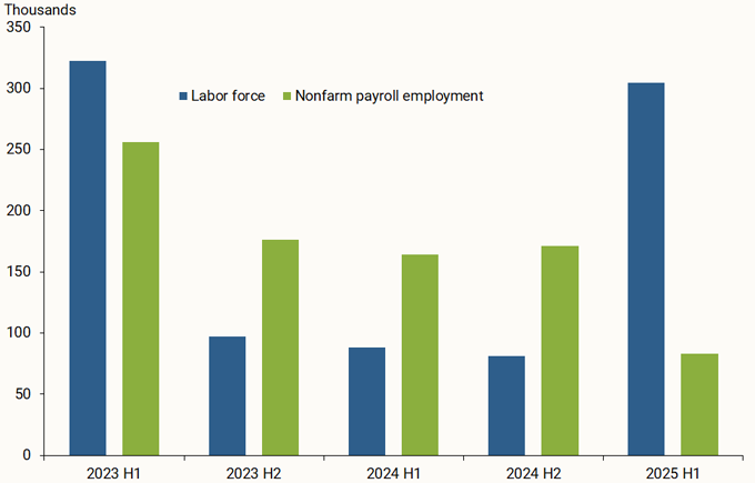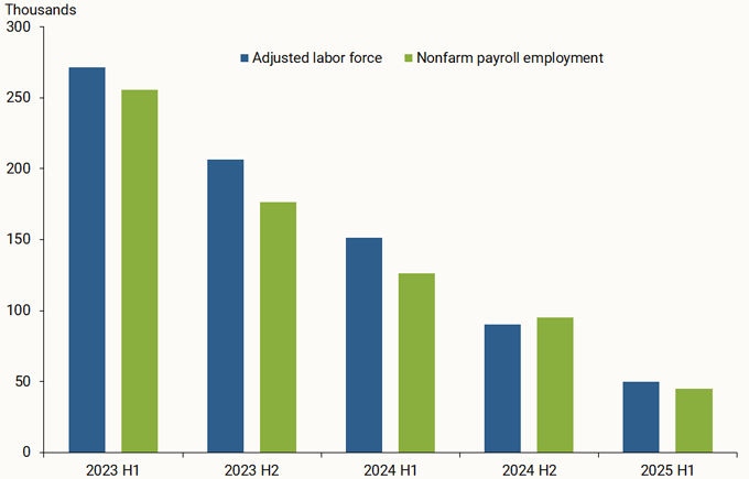 The figure demonstrates that both labor demand, as captured by payroll employment, and labor supply, as captured by the adjusted labor force, have slowed in tandem, from around 260,000 per month in the first half of 2023 to around 50,000 per month in the first half of 2025. This balanced slowdown has held the unemployment rate largely steady. However, the balanced slowdown is not evident in the unadjusted series.
