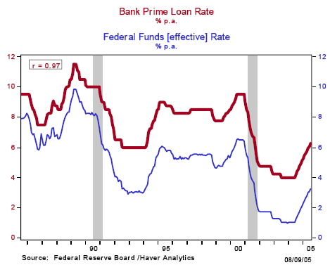 This is an interesting question for many borrowers. The prime rate is a “reference or base rate” that banks use to set the price or interest rate on many of their commercial loans and some of their consumer loan products. The prime rate tracks fairly closely with other short-term interest rates, such as the overnight federal funds rate; this relationship is illustrated in Chart I. As of June 2005, the bank prime rate reported on the Federal Reserve Board’s monthly H.15 Release, Selected Interest Rates, was 6.01 percent.