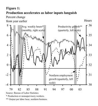 Although considerable research has uncovered the primary drivers of the late 1990s surge in productivity growth, the factors pushing productivity growth above its presumed trend in more recent years are less well understood. One possibility is that the very rapid pace of productivity growth since the recent recession reflected the lagged effects of past capital investment and increased efficiency in workplace organization. In that case, gains in the level of productivity should stick, as its growth proceeds closer to trend. Another possibility, however, is that a significant portion of the extraordinary gains reflected stopgap measures that gave only a temporary boost to productivity. For example, since the recession, it has been common to hear stories about “business caution” brought on by an environment still jolted by the effects of September 11, 2001, the wars in Afghanistan and Iraq, the IT bust, and corporate governance scandals. This caution may have led businesses to meet increases in demand by pushing their existing workers harder, perhaps to unsustainable levels, rather than by hiring more workers. Therefore, as businesses become more confident and expand hiring, the unwinding of the earlier, temporary gains in productivity would push productivity growth below its underlying trend.