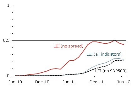 The odds-ratio and LEI indicator combination addresses the first of the two issues we identified when making turning-point predictions with the LEI, namely the problem of determining appropriate weights for each indicator. The solution to the second issue, the differential predictive power of the indicators at different time horizons, is rather simple. It consists of finding the best combinations of indicators associated with the odds-ratio between expansion/recession outcomes at increasingly distant future dates. Finding the best combination at each month over the next two years generates 24 different combinations of LEI components. Figure 3 uses this approach with data up to June 2010 to display the probability of recession for each month starting in June 2010 and ending in June 2012. The horizontal line at 0.5 coincides with the value at which the odds of an expansion and the odds of a recession are even, making it a natural cutoff for the probability of a binary outcome.