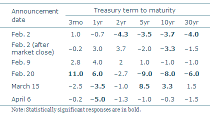 We use these daily responses to estimate the overall effect of Operation Twist in two ways. First, we consider the cumulative effect of the first four announcements, which occurred within a narrow three-week period. Each of these announcements represented an increase in the Treasury Department’s or Federal Reserve’s commitment to Operation Twist. One can interpret this cumulative effect as the initial effect of Operation Twist or what the total effect would have been with no future policy reversals or mixed signals. Second, we look at the cumulative effect of all six announcements in our sample. Here the interpretation is less clear-cut. For example, the fifth announcement, on March 15, reversed some of the initial effects of the program. There is also more time between the fourth, fifth, and sixth announcements, and after the sixth announcement, for more incremental information about Operation Twist to have come to light, such as the periodic issuance and refunding announcements by the Treasury and the actual purchases of Treasury securities by the Federal Reserve. Nevertheless, summing up the effects of the six announcements gives an estimate of the total effects of Operation Twist, including the effects of policy reversals and mixed signals.