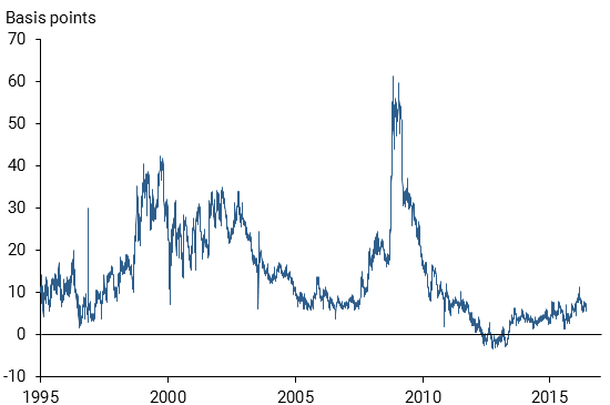 Researchers have cited several explanations for why newer nominal Treasury securities trade at a higher price than more seasoned ones. A common reason is that the newly issued security is available in greater quantities and is more liquid than older securities that have drifted into investors’ portfolio holdings. Another reason is that these bonds are preferred for overnight and short-term transactions because they have not changed much in nature relative to when they were first issued. Figure 1 shows a measure of the on-the-run premium based on the difference between par-coupon yields of seasoned 10-year Treasury bonds (as in Gürkaynak, Sack, and Wright 2007) and the yield on newly issued 10-year Treasury bonds (as reported in the Federal Reserve’s H.15 series). This yield spread has been positive since 1995 with the exception of a brief period between May 2012 and May 2013, when liquidity concerns appear to have mattered less because of large Fed Treasury purchases. Overall, it has averaged about 14 basis points (or 0.14 percentage point) and varies notably with persistent deviations from its mean for extended periods.