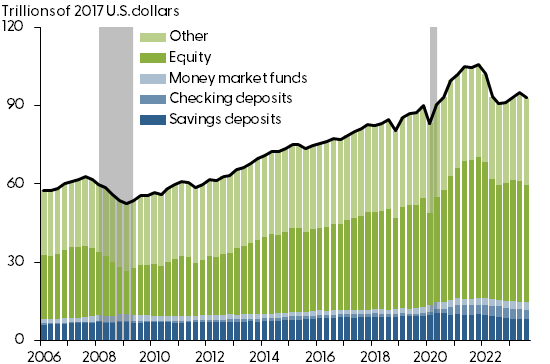 Figure 2 breaks real financial assets into its main components. Assets that are more liquid, meaning generally more accessible and easily turned into cash, are shown in blue tones, while less liquid assets are shown in green tones. Household equity holdings (dark green) make up about half of overall financial holdings and include corporate and noncorporate equities as well as mutual fund holdings. These declined noticeably through 2022, likely as a result of weak stock market performance and a decrease in corporate equity valuations.