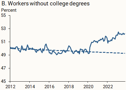 Looking deeper into the data reveals a distinct pattern to the shift in retirement behavior by level of education. The data in Figure 3 show that nearly all the surge in retirements around the arrival of COVID-19 is explained by the behavior of people age 55 and older without a college degree. Panel A shows that the retirement share of the population age 55 and older with a college degree approximately tracks a projection based on its pre-pandemic trend. However, the share for individuals without a college degree shown in panel B jumped from about 49% to 51% at the onset of the pandemic. Moreover, it appears to have continued increasing and diverging from its pre-pandemic trend since then. This share reached 52.2% near the end of 2023, well above the 49.3% projected from the pre-pandemic trend.