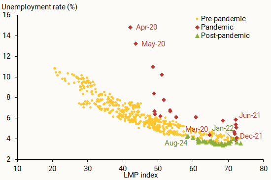 Figure 3 more closely examines the relationship between the LMP index on the horizontal axis and the official unemployment rate on the vertical axis. We separate the observations into three periods: the pre-pandemic period from June 1977 through February 2020 (gold dots), the pandemic period from March 2020 through December 2021 (red diamonds), and the post-pandemic period, January 2022 through August 2024 (green triangles). Figure 3 shows that before the pandemic, there was a tight downward-sloping relationship between the unemployment rate and the LMP index (gold dots). That is, higher values of the LMP index are associated with lower unemployment rates.