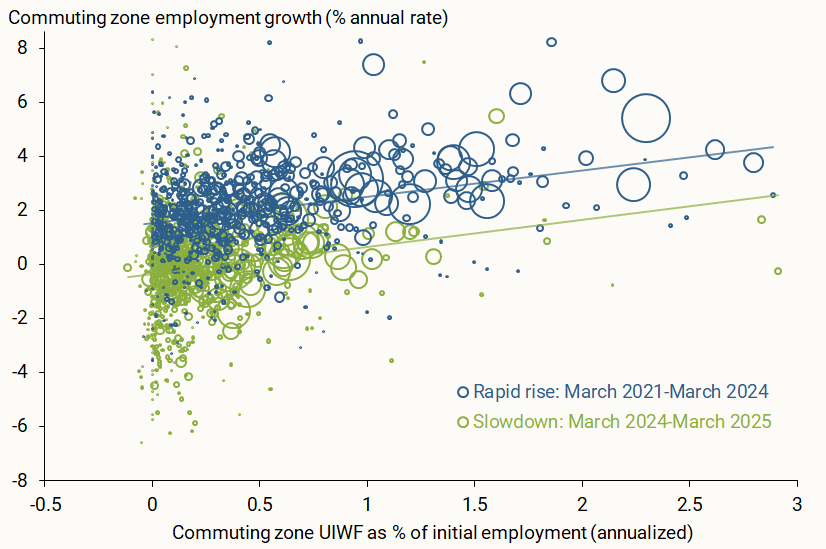 As an initial look at the data, Figure 1 shows a simple scatter plot relating unauthorized immigrant worker flows in each commuting zone on the horizontal axis to that area’s employment growth on the vertical axis for the rapid rise (in blue) and the slowdown (in green). The size of each circle is proportional to the area’s initial employment level. As noted above, we define the rapid rise period of increasing immigration as March 2021 to March 2024, and the slowdown as March 2024 to March 2025, starting and ending with the same calendar month to avoid complications from CEW data not being seasonally adjusted.