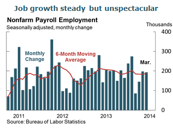 - A strengthening labor market is a crucial underpinning for developing a strong, self-sustaining economic recovery. The March jobs report posted a healthy payroll employment gain of 192,000. Clearly, the job market has shrugged off the adverse effects of the winter weather. Averaging over the past six months suggests continuing fairly solid gains in employment. Given the job gains over the past four years, the private sector has finally made up all the jobs lost during the recession. However, because the government is employing fewer workers now than at the start of the recession, total employment—private sector plus government workers—is still a half million jobs short of its peak. Of course, the population has been growing as well, so there is a long way to go to return to full employment.
