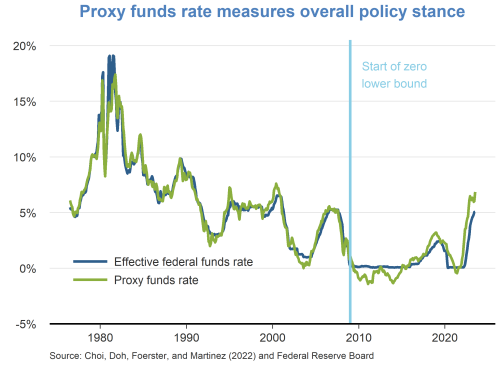 - The proxy federal funds rate gauges the overall stance of U.S. monetary policy, including Fed balance sheet actions and forward guidance. This indicator uses a set of 12 financial variables, including Treasury rates, mortgage rates, and corporate borrowing rates. It maps these financial variables into an effective level for the federal funds rate that can be compared with the actual funds rate. Current financial market conditions map to a proxy federal funds rate of about 6.9%, well above the actual funds rate. Indeed, the proxy federal funds rate has exceeded the actual federal funds rate since late 2021.