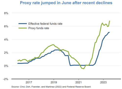 - The proxy federal funds rate showed a marked increase in June 2023, despite the pause in funds rate increases announced following that month’s FOMC meeting. The FOMC’s expectation of further funds rate increases in 2023 and its indication that policy will remain restrictive in 2024 contributed to increased interest rates for Treasury bonds and a higher proxy rate.