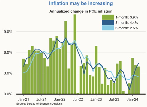 - Inflation data in recent months have been mixed, and progress towards the Federal Reserve’s 2% longer-run goal may have slowed. Monthly PCE inflation readings for the first three months of 2024 suggest that inflation may be increasing from levels observed towards the end of 2023. The three-month annualized change in the PCE price index in March was 4.4%, up from 0.6% in December 2023. However, April inflation readings measured by the consumer price index suggest that the elevated inflation readings in the first quarter might not continue into the current quarter, raising the possibility of renewed declines in headline and core PCE inflation in coming months.