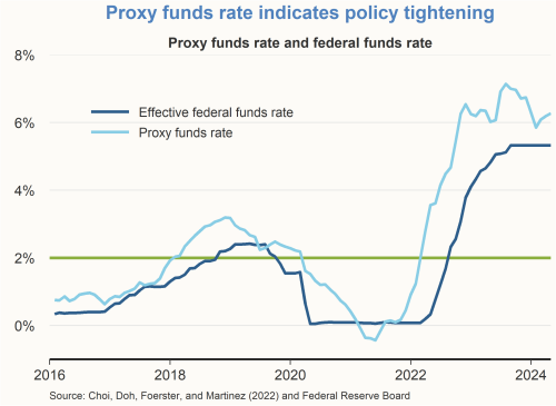 - Financial markets are projecting a markedly higher path for the federal funds rate relative to the path projected at the end of 2023. In December 2023, markets were projecting the Federal Reserve to make a total of six 25 basis point cuts in the federal funds rate by year-end 2024. In May 2024, the market is now projecting only two 25 basis point cuts by year-end 2024. Consistent with these projections, the proxy funds rate, which summarizes the broader stance of monetary policy, has increased since January 2024.