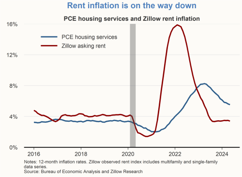 - Asking rent inflation as measured by the Zillow observed rent index that combines both multifamily and single-family series is now well below the housing services component of 12-month PCE inflation. Movements in asking rent inflation tend to lead movements in housing services inflation by about one year. Given that asking rent inflation is now close to the pre-pandemic average, we would expect to see continued declines in housing services inflation over the next year or so.