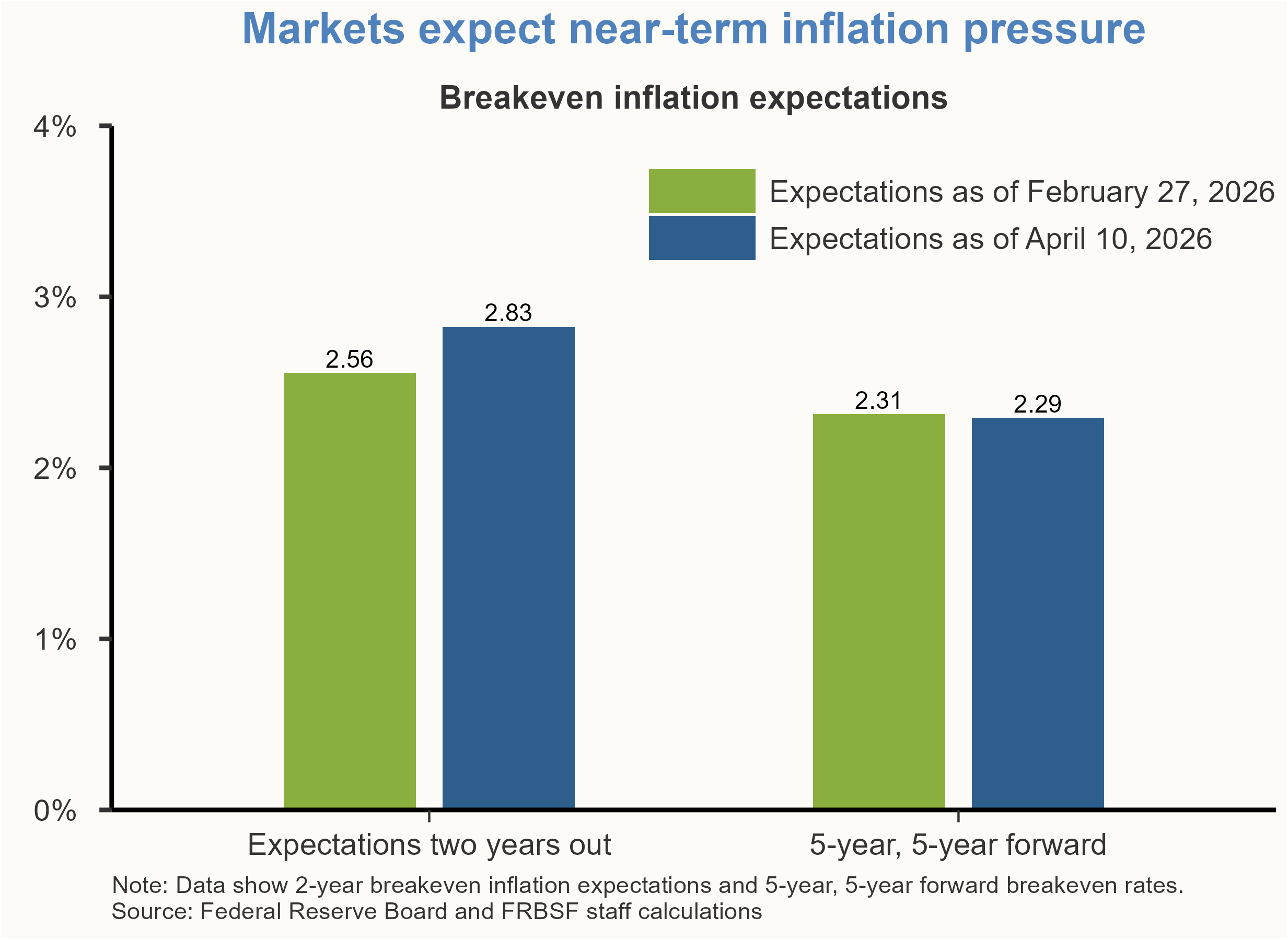 Market-based measures of inflation expectations over the next two years have climbed since the conflict began. These indicators are particularly informative, as investors’ financial positions provide a credible gauge of anticipated inflation trends. While near- and medium-term expectations have risen in response to the disruptions in energy markets, longer-term projections for the five-to-10-year horizon remain largely unchanged. This relative stability suggests that market participants continue to view long-run inflation as well anchored around 2%.