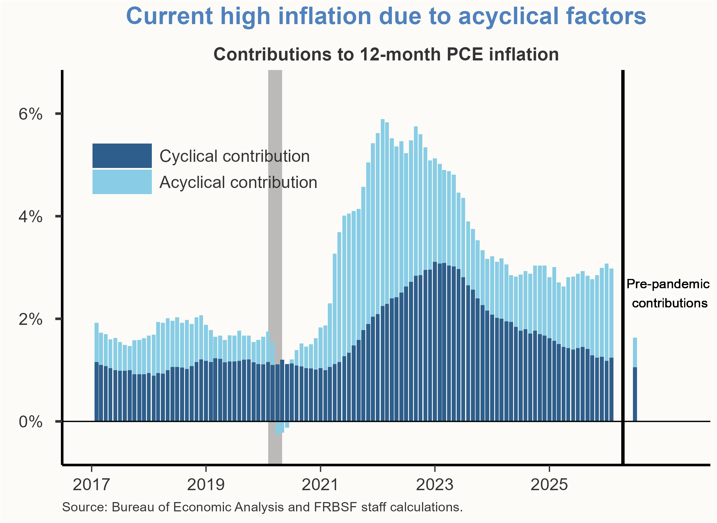 Latest readings from the San Francisco Fed’s Cyclical and Acyclical Core PCE Inflation data series show that current elevated inflation levels are primarily driven by acyclical factors, which include goods and services categories that are more sensitive to industry-specific factors. While the contribution from cyclical categories—those most sensitive to the business cycle—has returned to pre-pandemic levels, the contribution from acyclical components has been rising. These patterns suggest that while tight monetary policy and soft aggregate demand are putting downward pressure on inflation, sector-specific factors—such as tariffs and strong demand for semiconductors—have kept overall inflation from declining on net.