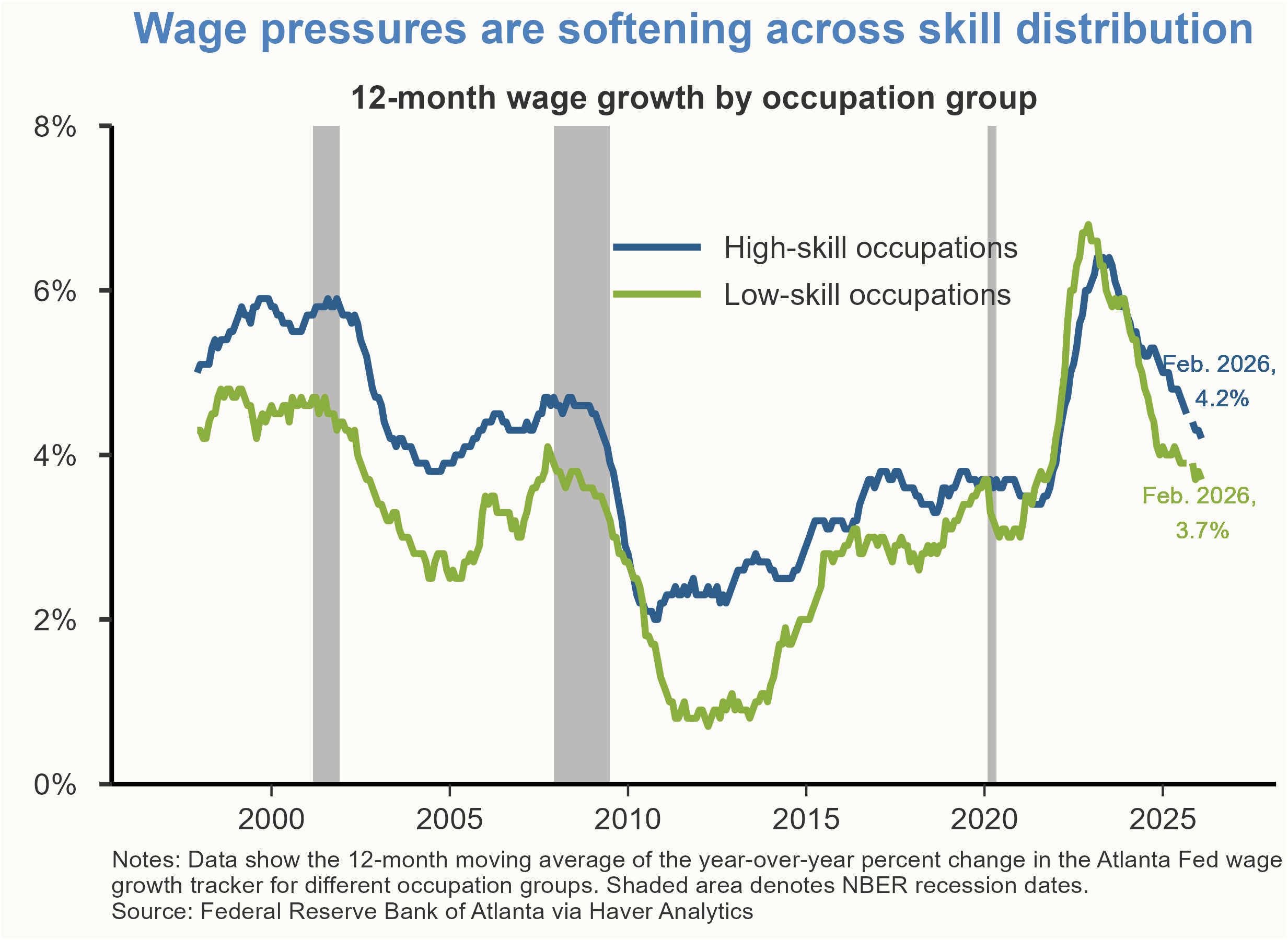 The cooling labor market is further evidenced by a broad-based deceleration in wage growth across all skill levels. According to the Atlanta Fed’s wage growth tracker, the pace of wage increases has slowed significantly from the peaks observed in 2024. While low-skill occupations previously saw wages rising faster than high-skill occupations during the post-pandemic recovery, that trend has since ended. Wage growth measures for both groups have now converged and are trending down together towards pre-pandemic norms.