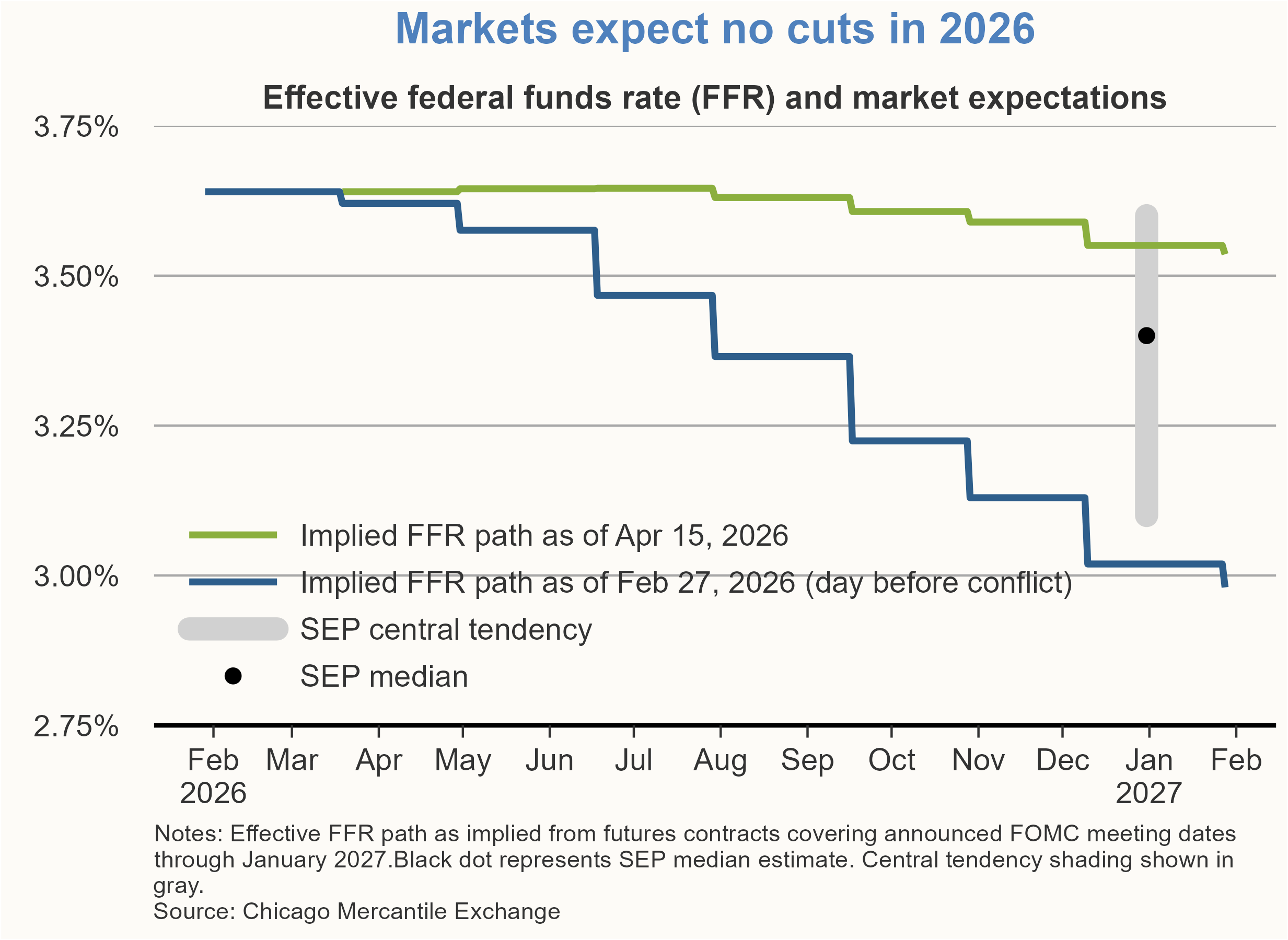 The market-implied path for the federal funds rate has shifted higher in response to the Middle East conflict. While markets had been pricing in two interest rate cuts for 2026, expectations have now pivoted to a hold for the remainder of the year. This shift suggests that investors view significant upside risks to inflation. Given that PCE inflation stood at 2.8% in February—prior to the start of the conflict—these new price pressures risk pushing the economy even further away from the Fed’s 2% inflation goal. The extent of the overall economic impact will ultimately depend on the duration of the supply disruptions.